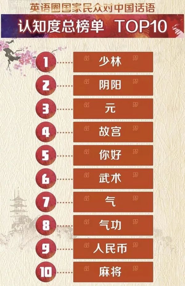 中国外文局曾在美英澳等8个英语圈国家的民众中做调查,并发布《中国话语海外认知度调研报告》,在这份报告中“少林”、“阴阳”、“气”、“气功”等词语挤进top10。