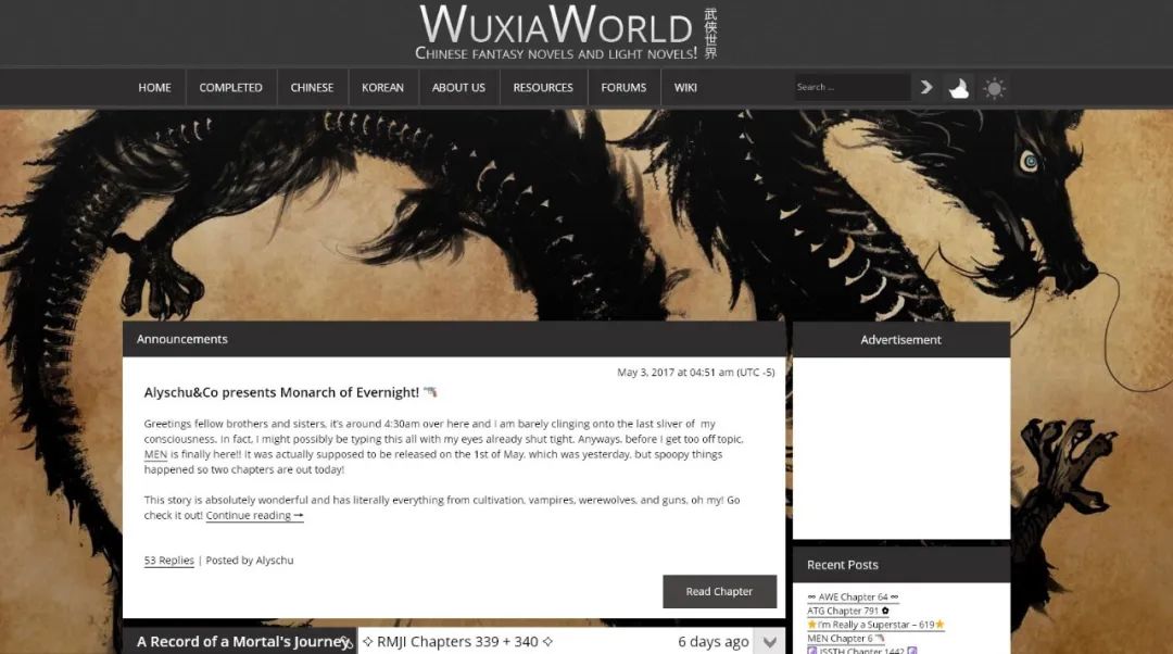在中国网文翻译第一阵地武侠世界(Wuxiaworld),每天都会更新大量翻译作品,这些来自东方的神秘仙侠小说在国外读者面前徐徐展开。