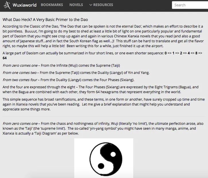 大部分中国人从没想到我国对世界的文化输出是从这些网文网站开始的。为了让老外们充分理解中国网文的内容,在Wuxiaworld上还有专门的板块介绍中文学习经验和道家文化基础,有关于阴阳、八卦的普及知识。