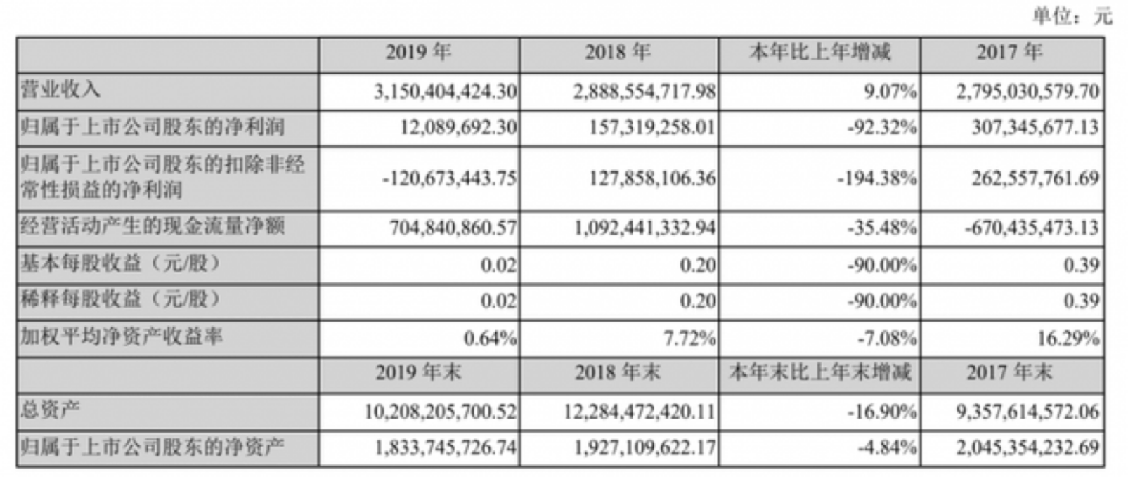 在控制权转让背后是京汉股份严重下滑的经营业绩。年报显示,2019年,京汉股份营业收入31.5亿元,归属于上市公司股东的净利润1208.97万元,扣非后净亏损1.20亿元 ,同比下滑194%;总资产同比下滑16.90%至102.08亿元。