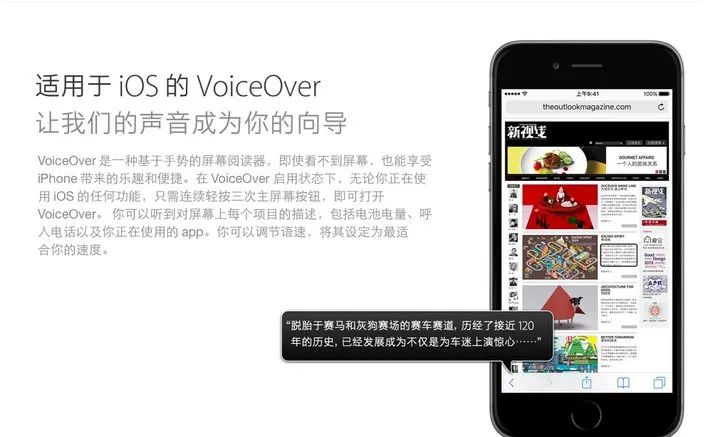 在智能手机的信息无障碍上,苹果和 Google 花了不少功夫。其中 iOS 的 VoiceOver 和 Android 的 TalkBack 这两款系统自带的屏幕阅读器,堪称电子时代的盲文。