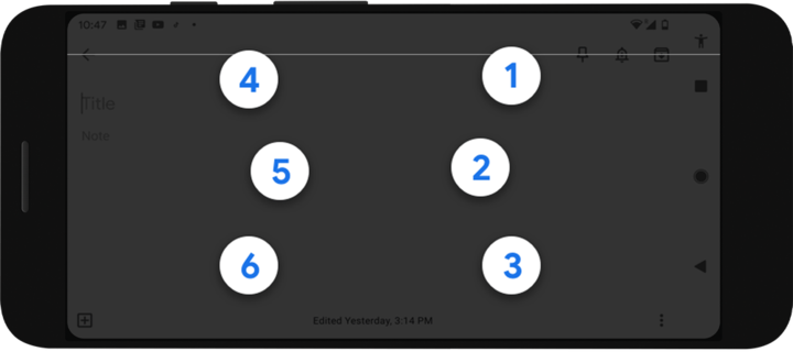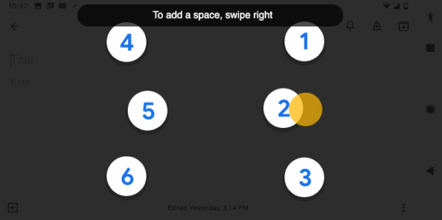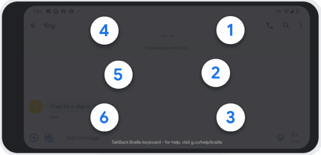 在 Google 的盲文输入法中,点击键位 1,则输入字母 A;同时点击键位 1 和 2 ,输入字母 B;同时点击 1 和 4 ,输入字母 C,同时点击 1、4、5,则输入字母 D,以此类推,暂时只支持英文。