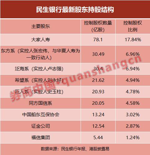 截至目前,民生银行主要股东包括:大家人寿、东方系(实控人张宏伟,与华夏人寿为一致行动人)、泛海系(实控人卢志强)、巨人系(实控人史玉柱)、希望系(实控人刘永好)、同方国信系、中国船东互保协会、福信集团。