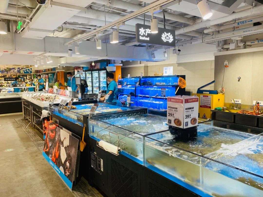 在覆盖一日三餐所需的基础上,盒马mini精简到了2000个SKU。但在精简SKU的同时,盒马的特色却得以保留。与很多社区生鲜店不同的是,盒马mini中设有活鲜区,只是在SKU上更接地气,去掉了一些大海鲜。