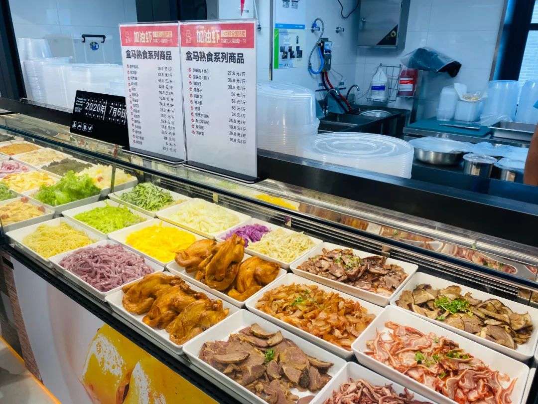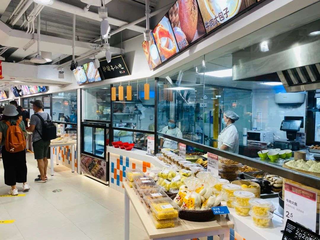 整个门店被划分成了两大块,右边一侧全部是现制现售的商品,在这样一个类似于美食街的区域里,除了盒马鲜生中常见的盒马工坊等自有品牌,还入驻了护国寺等北京本土小吃品牌。