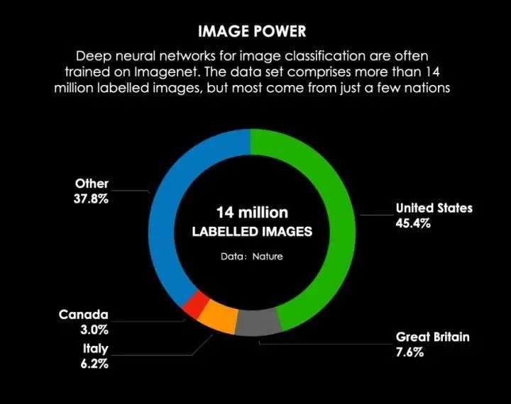 我们来具体看看,1400万张打了标签的图片究竟来自于哪里:美国占比45.4%,而美国的人口在全世界只占4%;其他国家占比37.8%,这里边包括中国和印度,而中国和印度的人口占到全世界的36%;同时,来自英国、意大利、加拿大的图片占比也是相对较多的,整体来讲,我们会发现白人世界占据了大部分。
