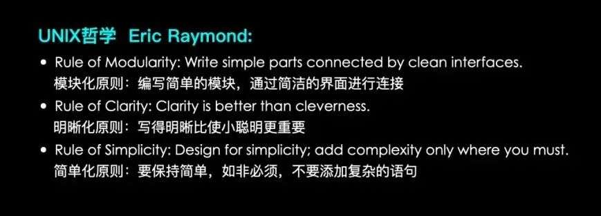 比如埃里克·雷蒙德(Eric Raymond)谈到的Unix哲学的逻辑,他谈到的模块化逻辑、明晰化逻辑、简单化逻辑等已经被人们普遍认为是编程语言当中的首要原则。