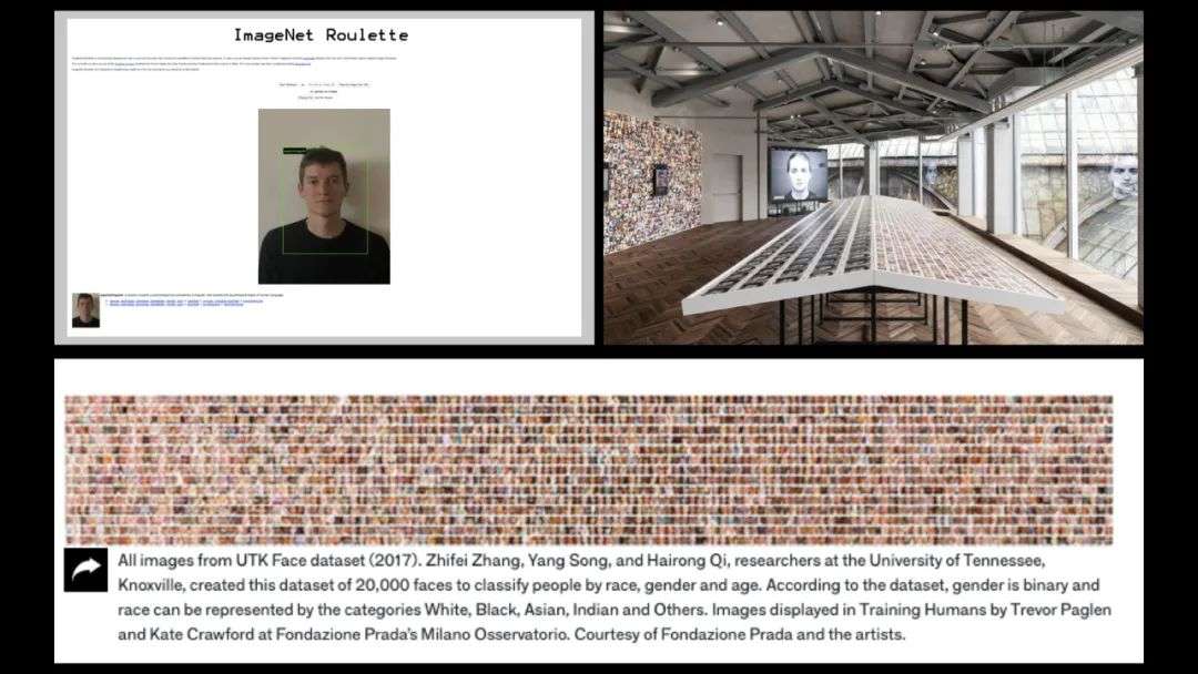 这个数据集当中也包含了大量的以人脸图片为主的数据,基于这些数据做艺术化的表达。两位艺术家想说明的是,人们习以为常的,仅作为技术来看待的面部识别技术,背后隐藏着非常大的文化、身份、种族的偏见。