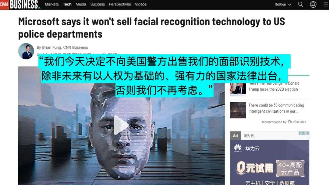 之后,微软发表声明,提出以后将终止向美国的警察机构出售他们的面部识别技术。他们谈到,“我们今天决定不向美国警方出售我们的面部识别技术,除非未来有以人权为基础的、强有力的国家法律出台,否则我们不再考虑”。