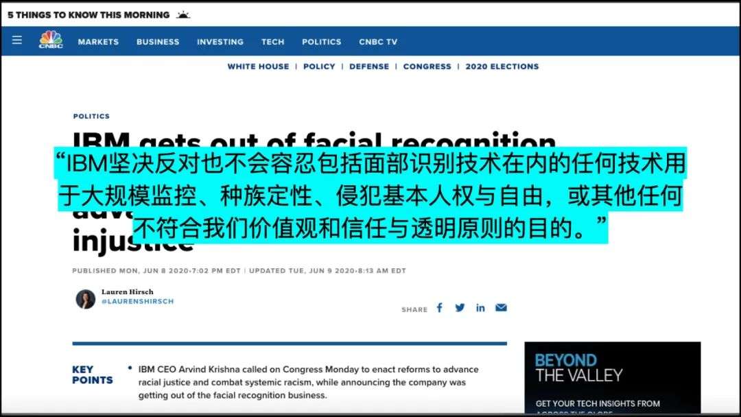 与此同时,其他商业巨头如亚马逊和IBM都发出了类似的声明。IBM的首席执行官明确谈到,“IBM坚决反对也不会容忍包括面部识别技术在内的任何技术用于大规模监控、种族定性、侵犯基本人权与自由,或其他任何不符合我们价值观和信任与透明原则的目的”。