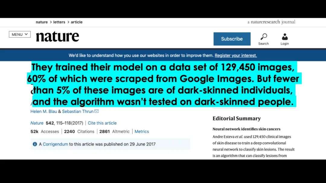 当时他们用了很多谷歌的图片,但是谷歌图片当中只有不到5%是来自黑色人种,所以算法就没有办法测试深皮肤人群。