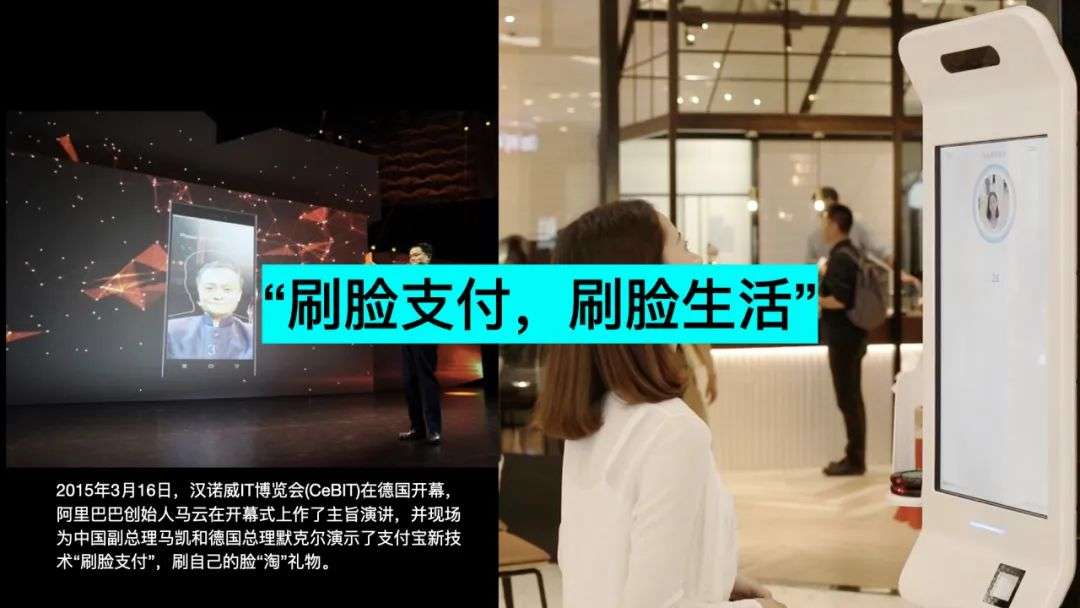 2015年,阿里巴巴创始人马云在主题演讲中,现场为德国总理默克尔演示支付宝刷脸支付的功能,从此开启了阿里巴巴以及支付宝力推的“刷脸支付,刷脸生活”。