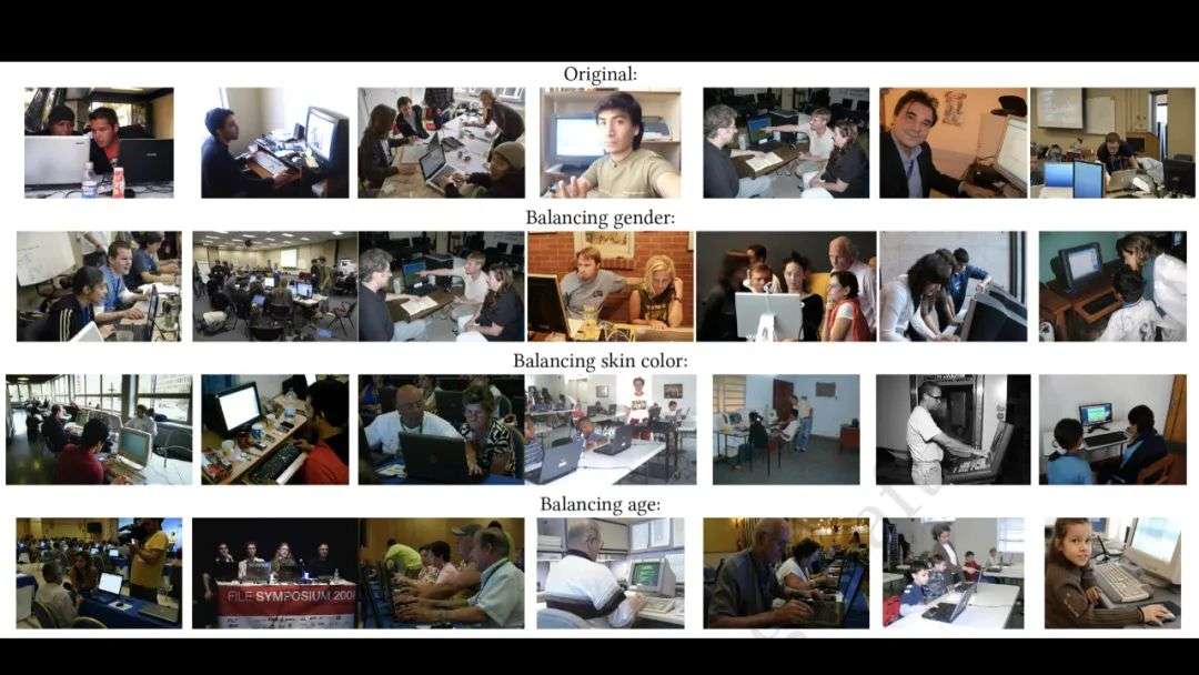 他们首先要平衡的是什么?是性别。他们会在办公场景中有意识地放入有女性形象的图片,以确保让计算机学会识别工作场景的时候不仅仅只有男性。