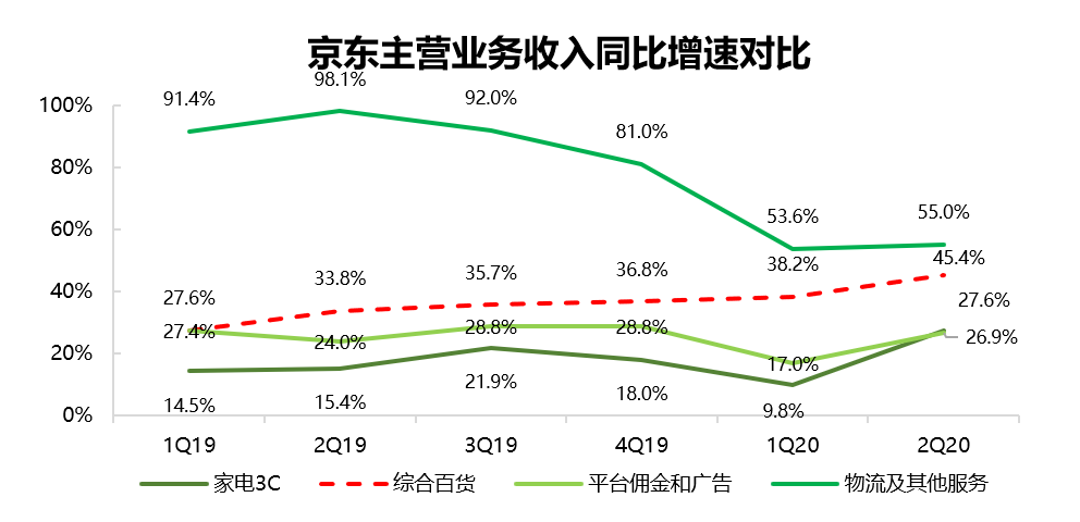 最关键的是,这一成绩是在疫情已经平稳之后的第二季度取得的,如果说疫情是第一季度综合百货快速增长的催化剂,那第二季度的完美成绩则向市场证明了京东的吸引力并不会因为外部环境的改变而削弱。