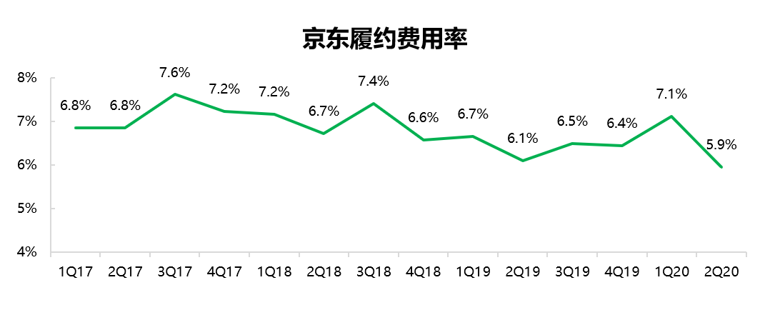 第二季度,京东履约费用由去年同期的6.1%和上季度的7.1%下降至5.9%,达到了历史最低水平。京东在财报中认为,履约费用率的下降得益于社会化物流的贡献。