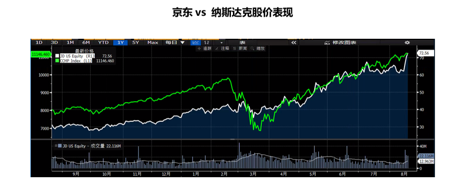 第二季度,京东(JD US)又交出了一份超预期的成绩单,财报后股价连续跳升,截止8月20日美股收盘,京东市值达1150亿美元,其港股市值也超9000亿创历史新高。自今年3月开始,因在疫情期间展现了强大的运营能力,京东一改此前的颓势,即便在美股连续熔断的特殊时期,其股价表现也十分稳定。
