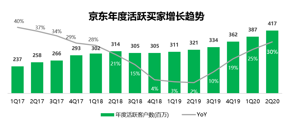 财报数据显示,截至2020年6月30日,京东过去12个月的月活达到4.17亿,单季度新增3000万,同比30%的增速也创下近11个季度以来的新高,其中主打下沉市场的京喜功不可没。