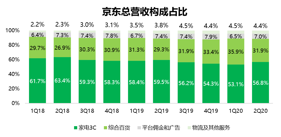 事实上,在京东最开始起步的阶段,3C和家电一直都是京东的特色和标签,这一点我们从京东的收入构成上也可以窥视一般。财报数据显示,家电3C的产品销售收入占京东总营收的比重一直超过半数,尽管这一比例呈总体下降的趋势(56.8%,2Q20 vs 63.4%,2Q18),但仍然是京东最主要的收入来源。