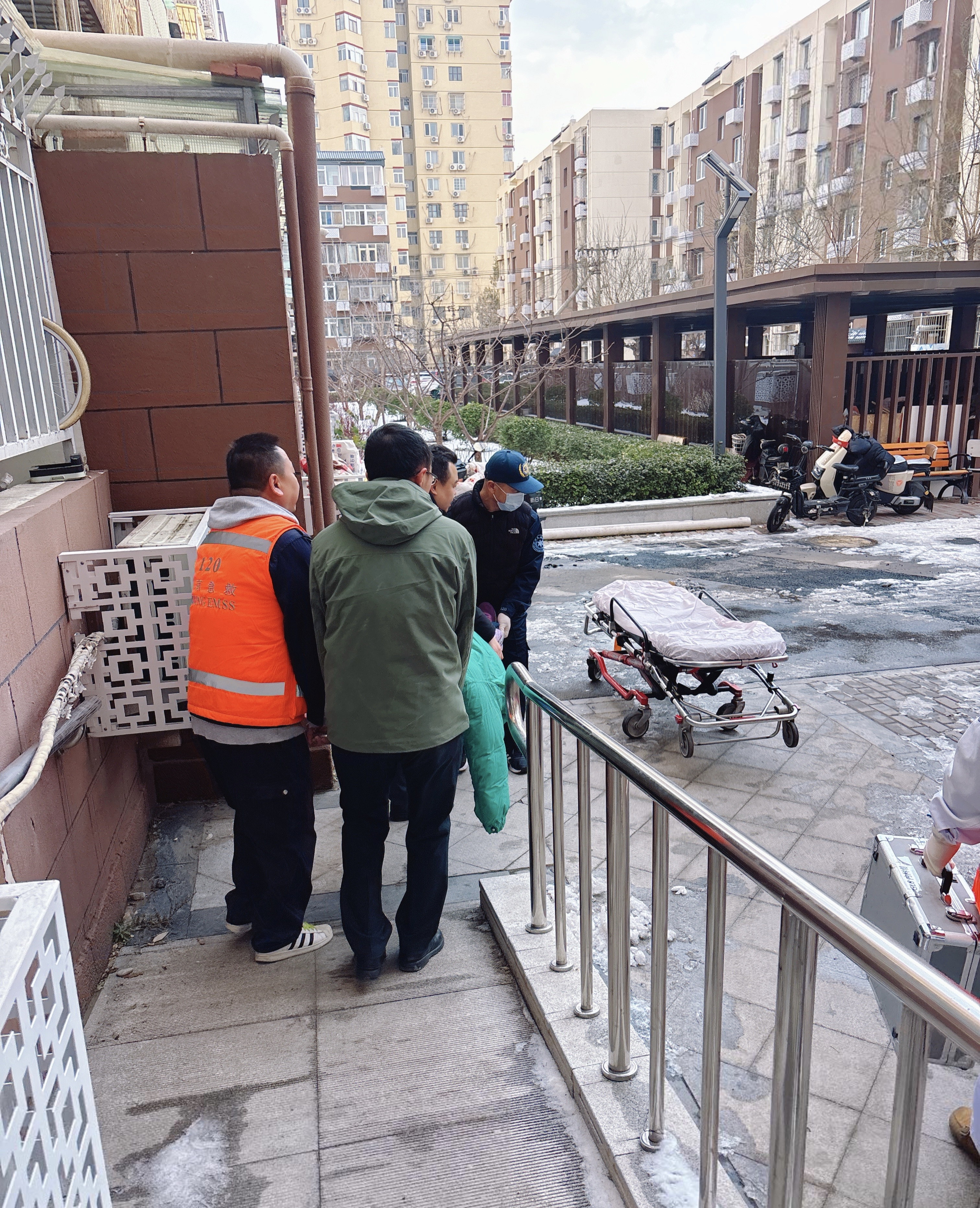 靳学玲记得王大妈之前曾提到过自己患有高血压,还安装过心脏支架。于是她立刻叫上商圈经理燕玲,火速赶往老人家中。在门口等候了几分钟后,老人才缓缓打开房门,只见老人面色苍白、浑身无力,精神状态十分萎靡。“等120来了,我们陪您一起去医院,您别担心。”靳学玲和燕玲一边安慰王大妈,一边帮着收拾相关证件准备出发。考虑到老小区楼梯狭窄,两人又联系了店内男同事杨增铭、韩国利前来帮忙。不久,120救护人员赶到,大家一起把王大妈抬下楼送上救护车,前往附近的医院进行治疗。
